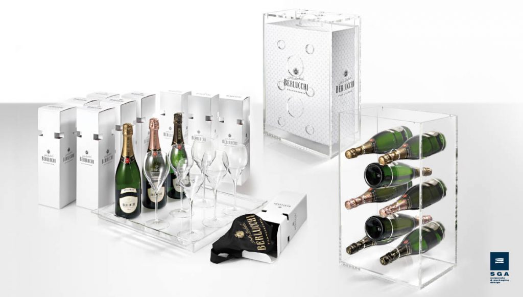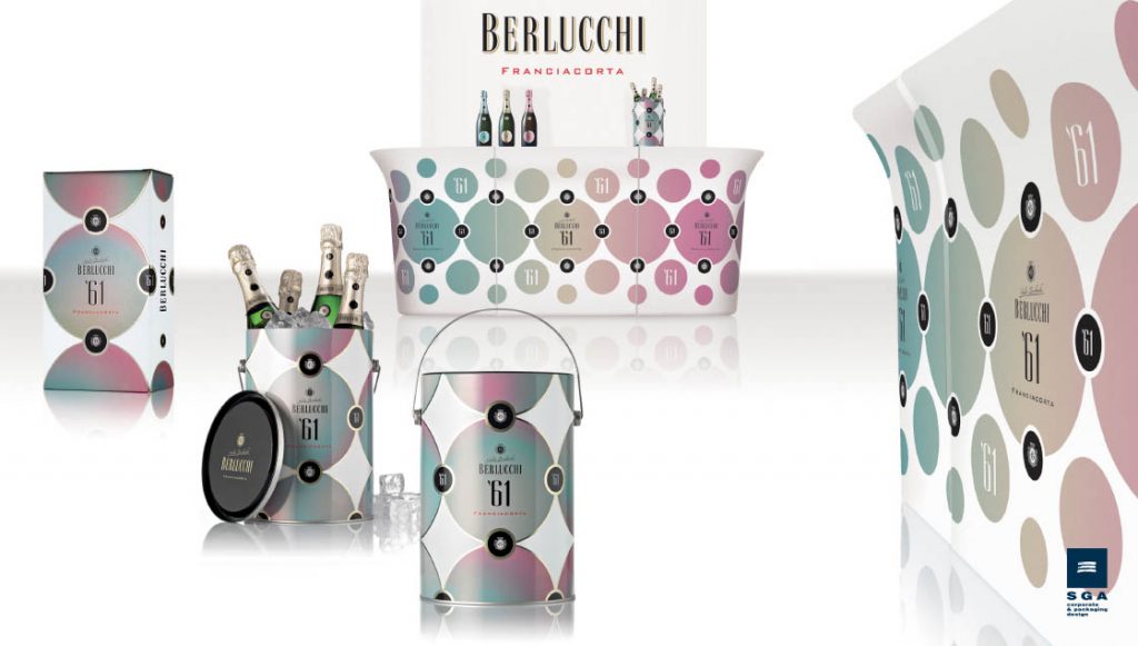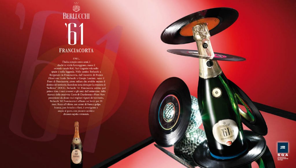 Berlucchi, con la creazione di diverse linee ben distinte, si è posta l’obbiettivo di diversificare il proprio portafoglio prodotti configurandone una suddivisione mirata a dialogare con target specifici. Con la linea ‘61 l’azienda afferma non solo il primato nella denominazione Franciacorta, ma si propone di rendere più attuale la percezione della propria identità . Da qui la necessità di caratterizzare il packaging con uno stile nuovo, capace di intercettare un target giovane, frequentatore di bar, locali trendy e ristoranti di tendenza. Dallo studio del packaging è scaturito lo sviluppo coerente di un vero e proprio mood di forte impatto, successivamente applicato ai secondary packaging e a tutti gli elementi necessari ad allestire un evento.