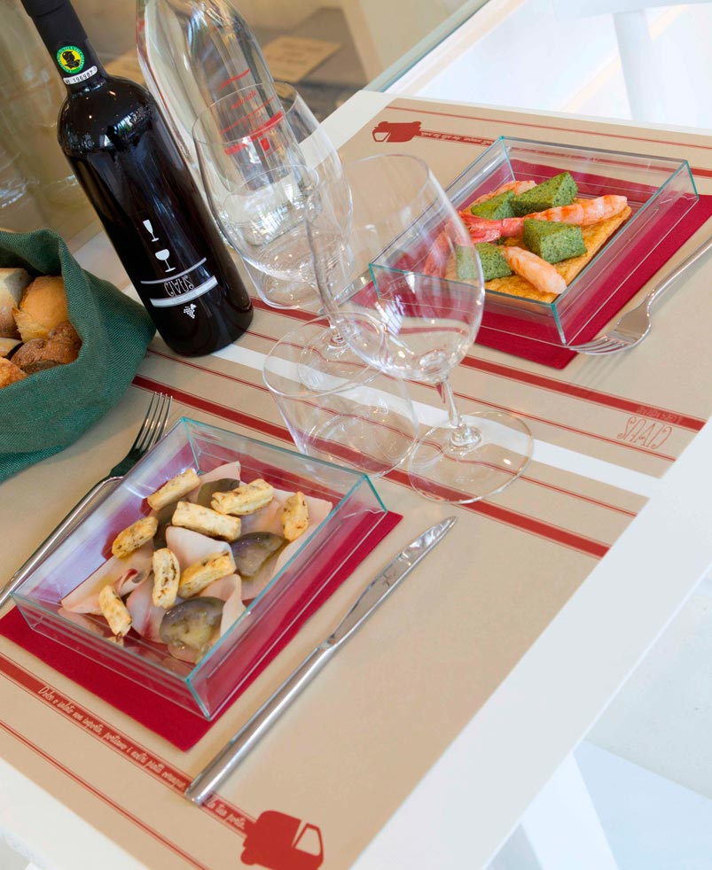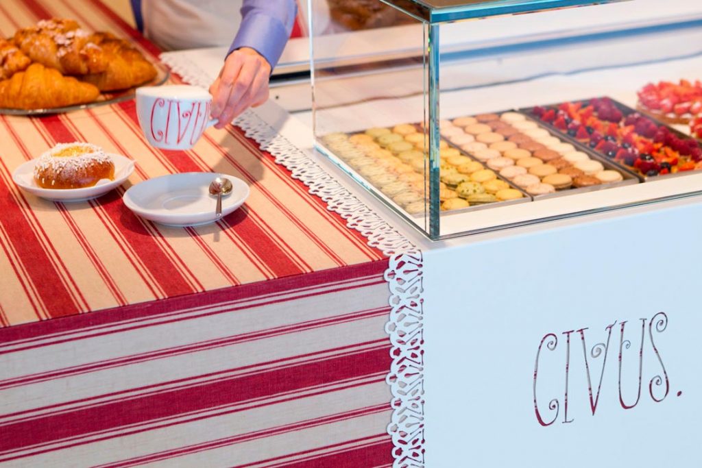 L’eleganza e l’essenzialità si mescolano con il calore della stoffa a righe, per ricordare casa anche nella raffinatezza dei dolci e delle pietanze di Civus.